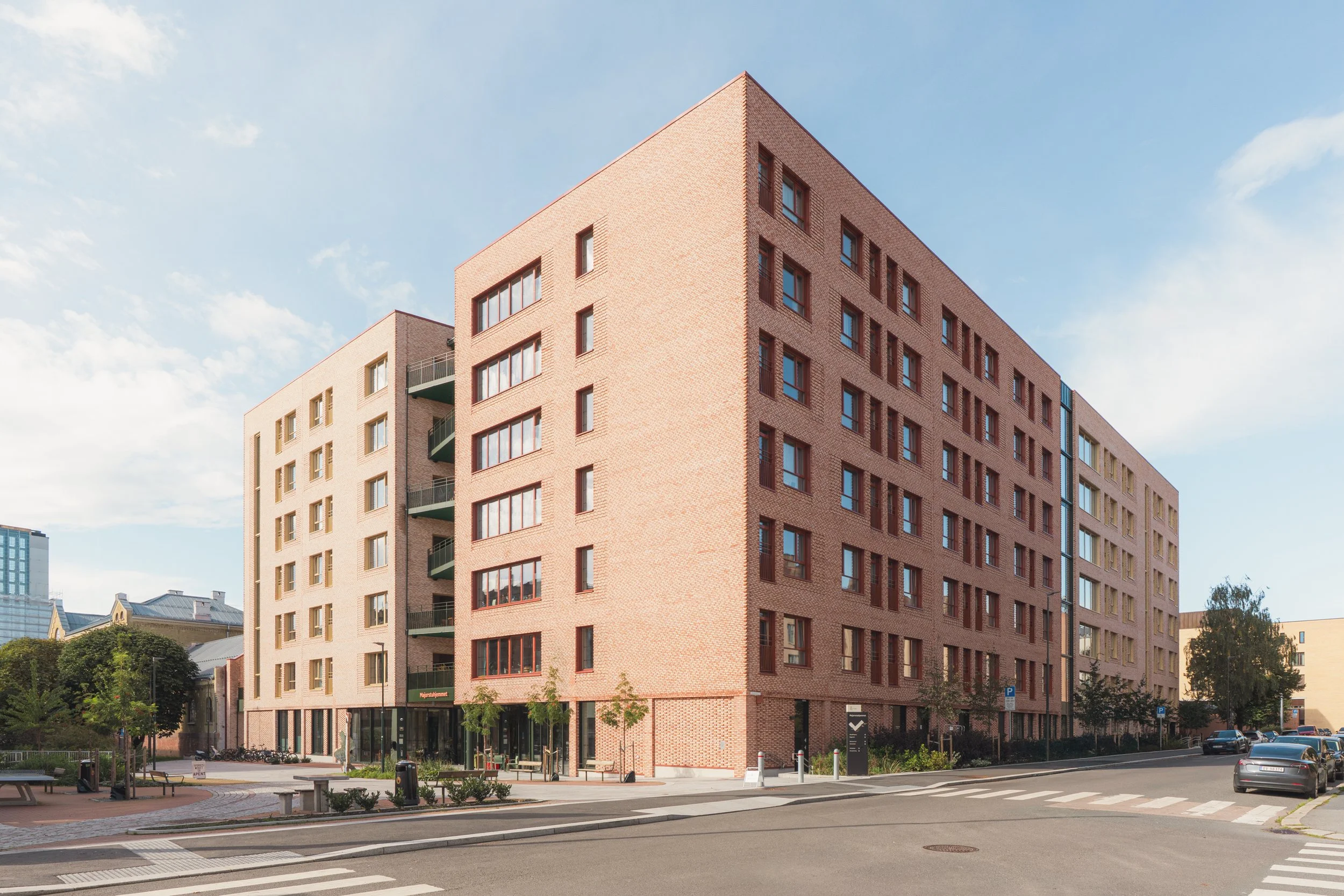 Fasaden består hovedsakelig av tegl i samme sten, men ulike fugfarger, forbandt og relief som skaper en fasade med stor variasjon og detaljering.