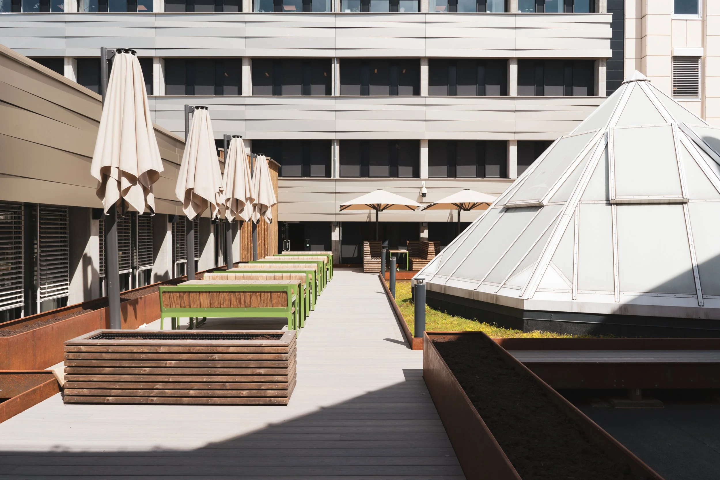 terrassemøbler, samt plantekasser og avgrensinger i cortenstål. Takterrassen er i direkte kontakt med personalrestauranten, som også har fått en oppgradering i form av overflater, kjøkken og serveringsområde.