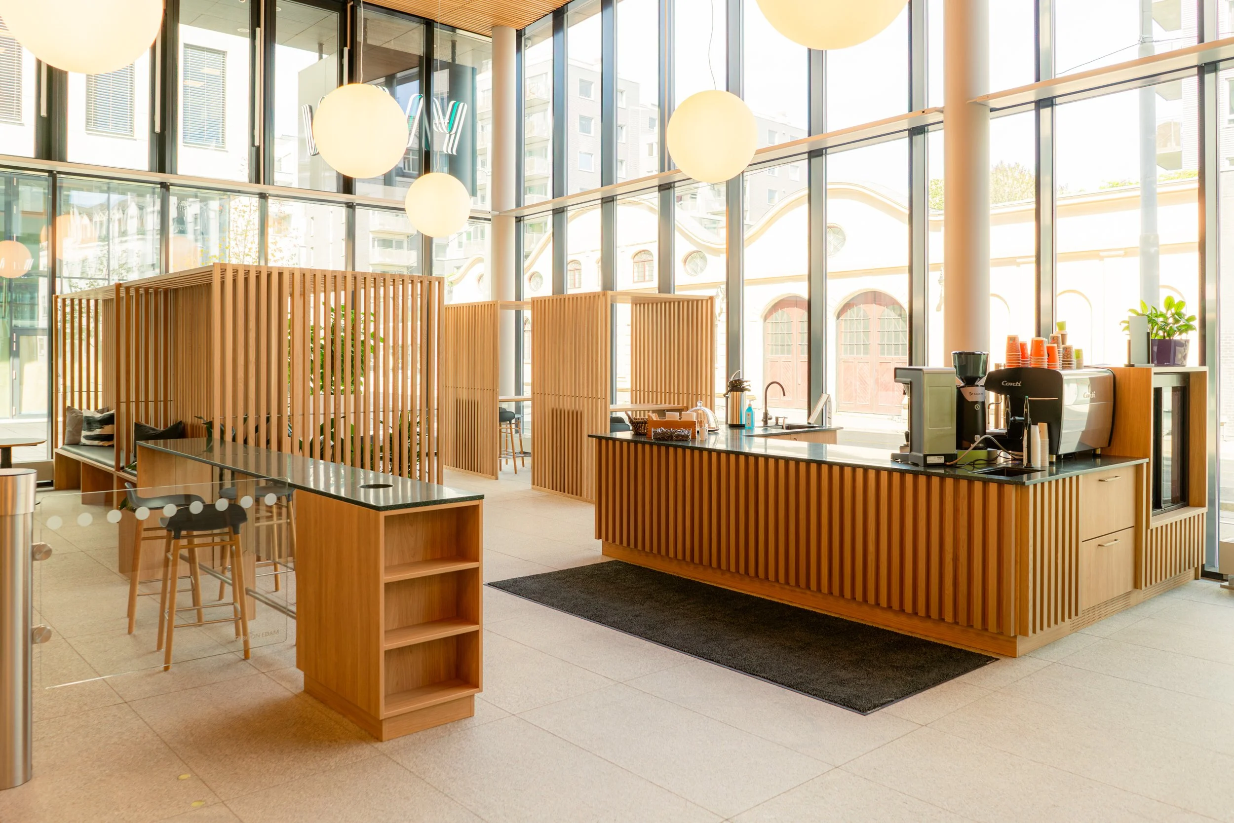 Man etablerte også en kaffebar i forbindelse med dette med uttrykk og materialitet som henger sammen med spilehusene. Spiler ble ikke bare valgt for å avskjerme og dele opp soner, men også for å bevare karakteren til det store rommet, noe man ikke hadde oppnådd i samme grad med tette vegger.